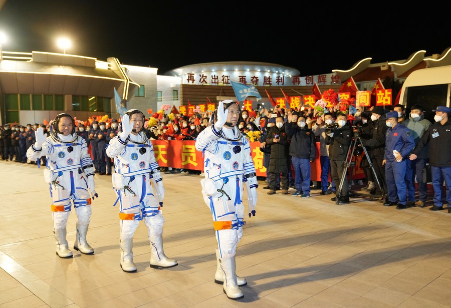 A see-off ceremony for three Chinese taikonauts of the Shenzhou-15 manned space mission is held at the Jiuquan Satellite Launch Center in northwest China, Nov. 29, 2022.(Xinhua/Li Gang)