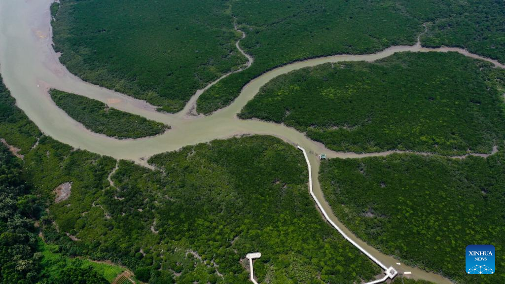 This aerial photo shows a view in Shankou Mangrove Nature Reserve in Hepu County of Beihai City, south China's Guangxi Zhuang Autonomous Region, May 20, 2023. (Xinhua/Zhang Ailin)