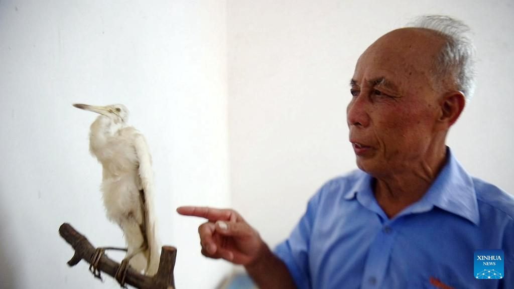 Mo Jirui introduces the making process of egret specimen in Shankou Mangrove Nature Reserve in Hepu County of Beihai City, south China's Guangxi Zhuang Autonomous Region, May 20, 2023. (Xinhua/Zhang Ailin)