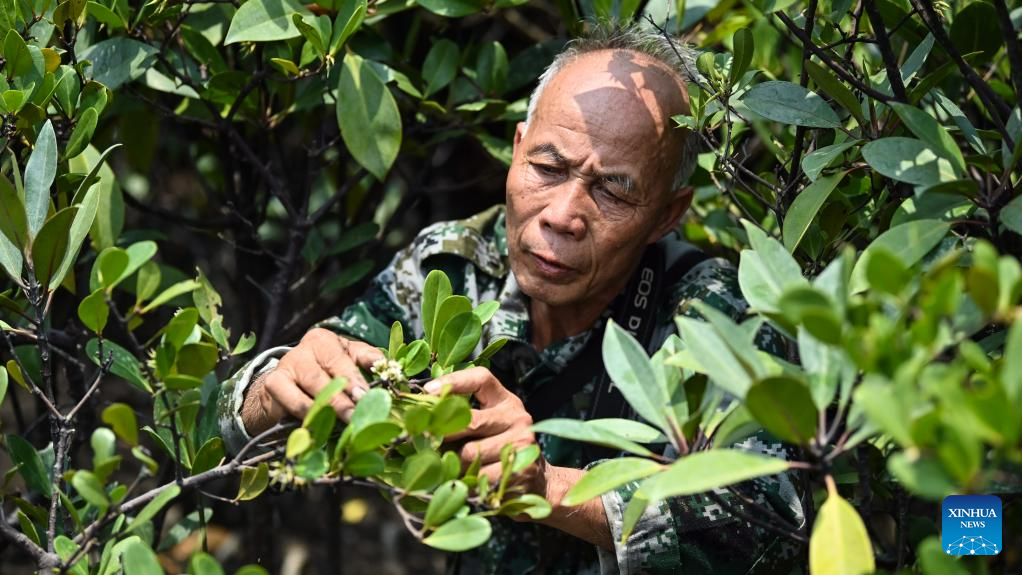 Mo Jirui collects pollen in Shankou Mangrove Nature Reserve in Hepu County of Beihai City, south China's Guangxi Zhuang Autonomous Region, May 20, 2023. (Xinhua/Zhang Ailin)