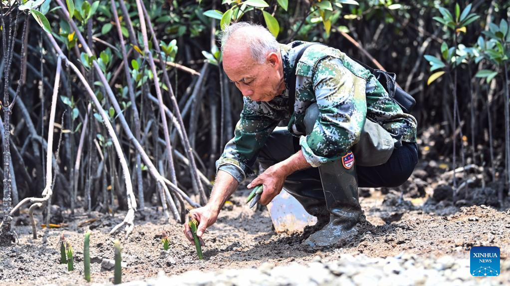 Mo Jirui cultivates mangrove seeds in Shankou Mangrove Nature Reserve in Hepu County of Beihai City, south China's Guangxi Zhuang Autonomous Region, May 20, 2023. (Xinhua/Zhang Ailin)