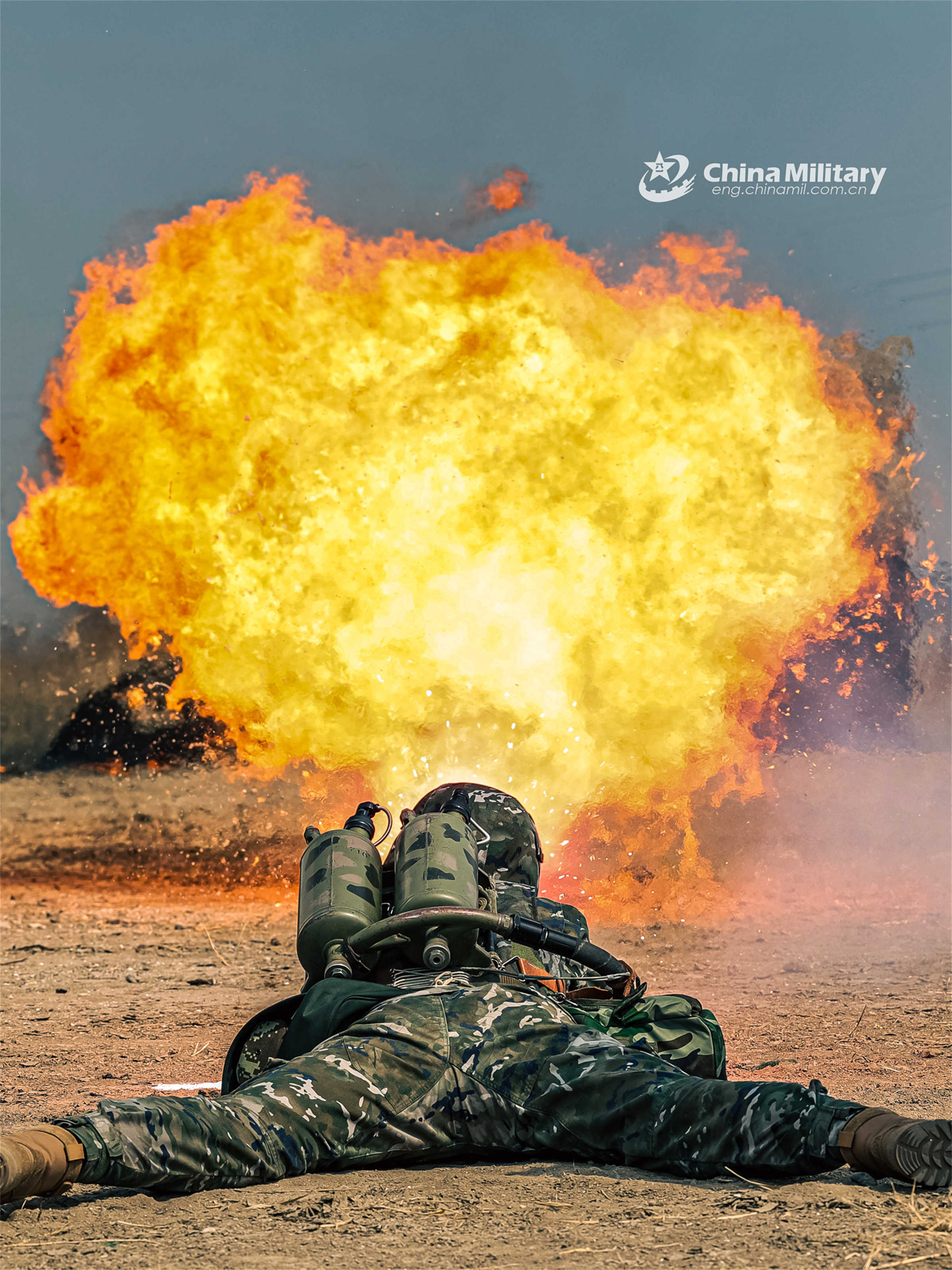 A flamethrower operator ignites a controlled fire to burn down the simulated target during a recent attacking drill. He is assigned to a chemical-defense element with a mobile detachment under the Chinese People's Armed Police (PAP) Force Tianjin Corps. (eng.chinamil.com.cn/photo by Wang Liang)
