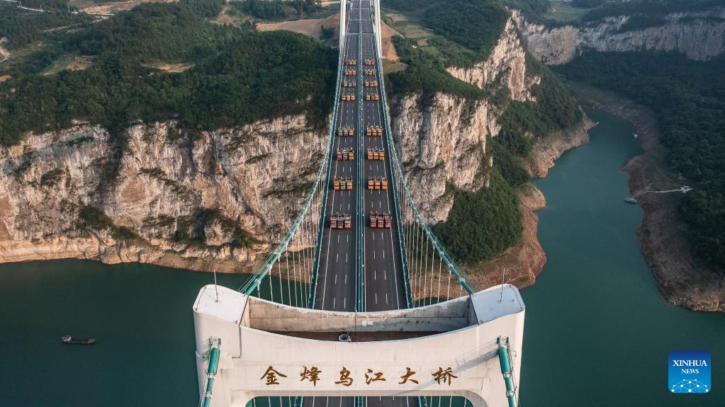 This aerial photo taken on May 21, 2023 shows the Jinfeng Wujiang River Bridge under static load testing in southwest China's Guizhou Province. Static load testing, including symmetrical and asymmetrical rounds, were conducted on the bridge Sunday. The bridge, which is 1473.5 meters in length, is a main project on the Guiyang-Jinsha-Gulin expressway. (Xinhua/Tao Liang)