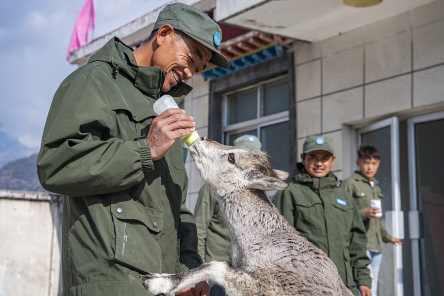 Migmar, a former logger and hunter who has become a wild animal rescuer, feeds a rescued bharal at the wildlife rescue station of Qomolangma National Nature Reserve, southwest China's Tibet Autonomous Region, March 14, 2023. (Xinhua/Sun Fei)