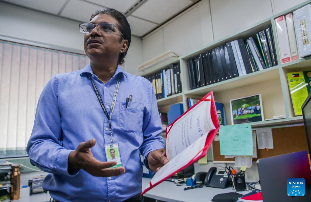 Hans Raj Bhardwaj, research director and head of the rice breeding innovations platform at the International Rice Research Institute (IRRI), speaks during an interview with Xinhua in his office in Laguna Province, the Philippines on May 16, 2023. (Xinhua/Rouelle Umali)