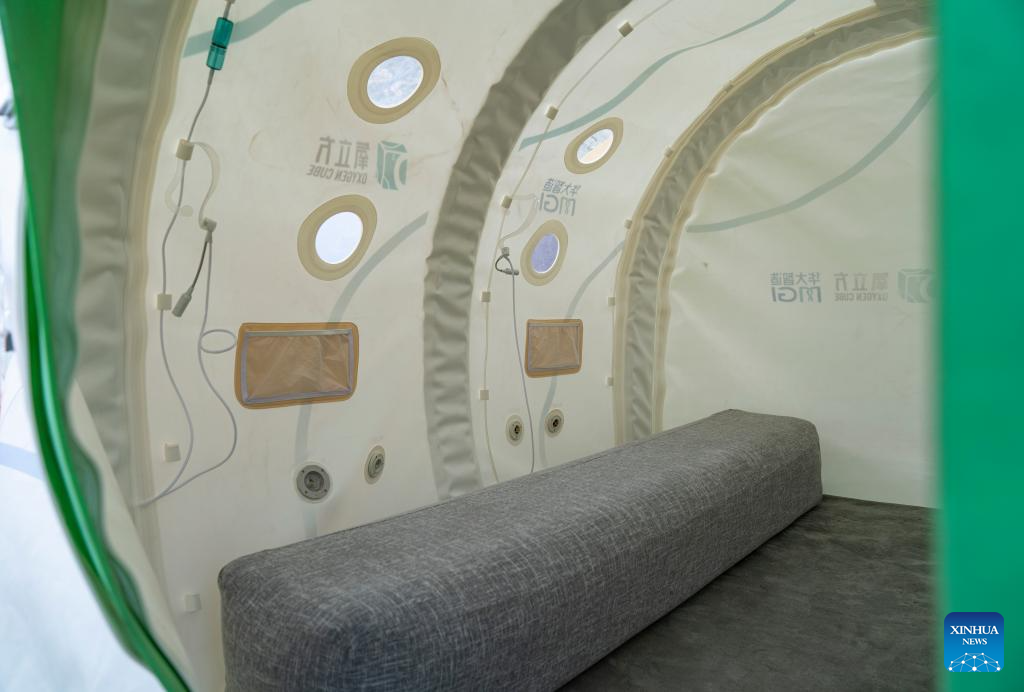 This photo taken on May 22, 2023 shows a gym inside a tent at the mountaineering base camp in the Qomolangma National Nature Reserve in southwest China's Tibet Autonomous Region. (Xinhua/Sun Fei)