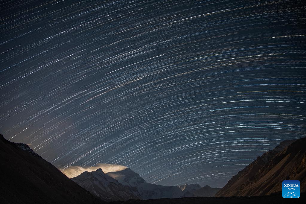 This composite photo taken on May 10, 2023 shows star trails above Mount Qomolangma in southwest China's Tibet Autonomous Region. (Xinhua/Sun Fei)
