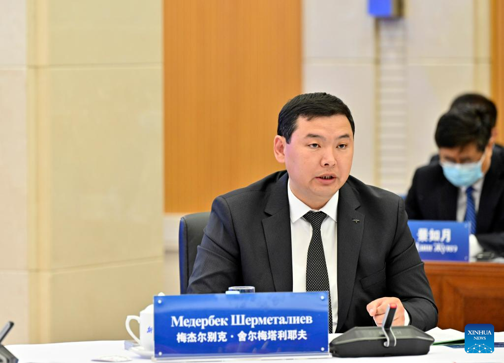 Mederbek Shermetaliev, head of the Kabar News Agency of Kyrgyzstan, speaks at the China-Central Asia News Agency Forum, in Beijing, capital of China, May 23, 2023. A forum on strengthening collaboration among media outlets in China and Central Asian countries was held in Beijing on Tuesday. The China-Central Asia News Agency Forum, themed on "boosting media cooperation to promote the building of a China-Central Asia community with a shared future," was one of the achievements of the recently concluded China-Central Asia Summit. The forum was initiated and hosted by China's Xinhua News Agency and attended by heads and representatives of media outlets from five Central Asian countries, namely, the Television and Radio Complex of the President of the Republic of Kazakhstan, Kabar News Agency of Kyrgyzstan, Khovar News Agency of Tajikistan, Media Turkmen News Agency and Uzbekistan National News Agency. During the forum, a consensus was reached among media outlets in China and the five Central Asian countries to strengthen and expand cooperation further, aiming to elevate its scope and explore additional avenues of collaboration. (Xinhua/Jin Liangkuai)