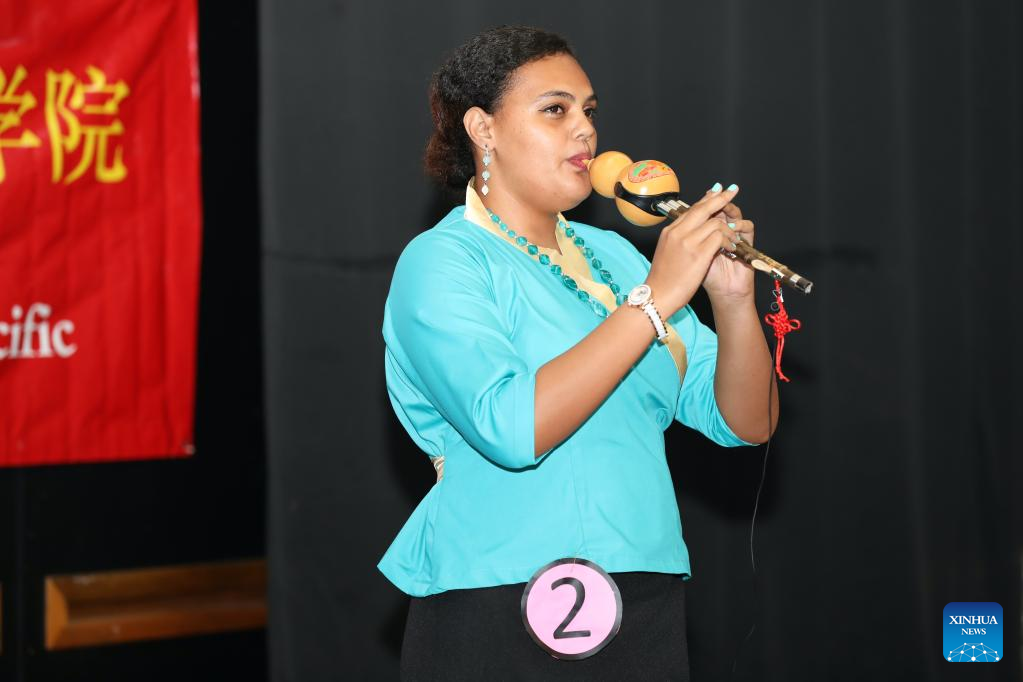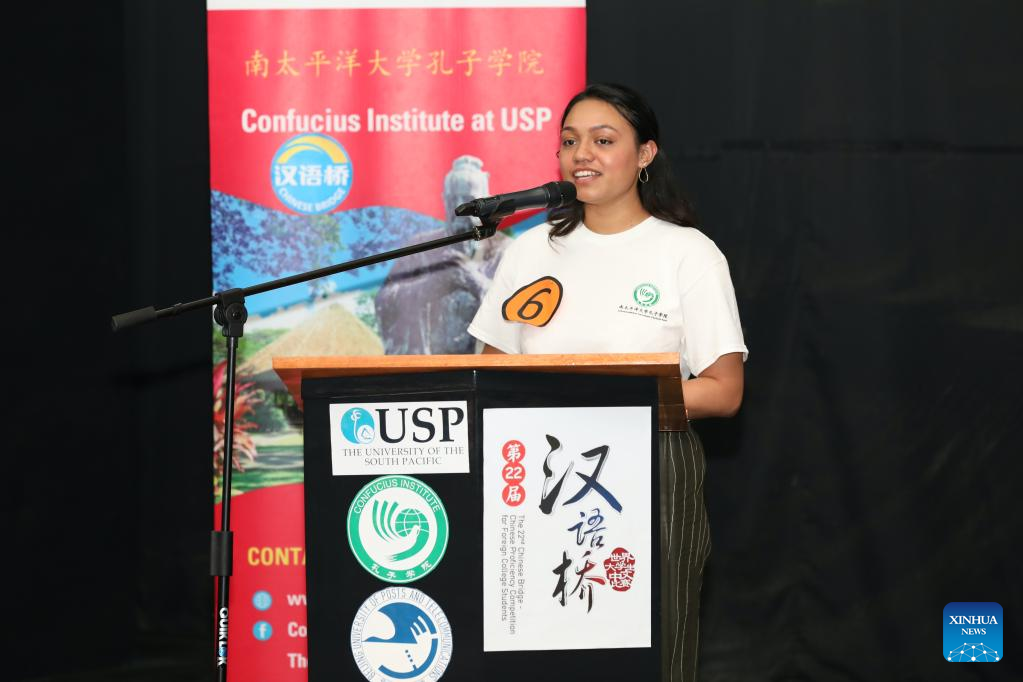 Lily Teunroko from the University of the South Pacific in Suva wins in the final round of the 22nd Chinese Bridge Competition for Fijian college students in Suva, Fiji, May 23, 2023. (Photo by Sang Qinlong/Xinhua)