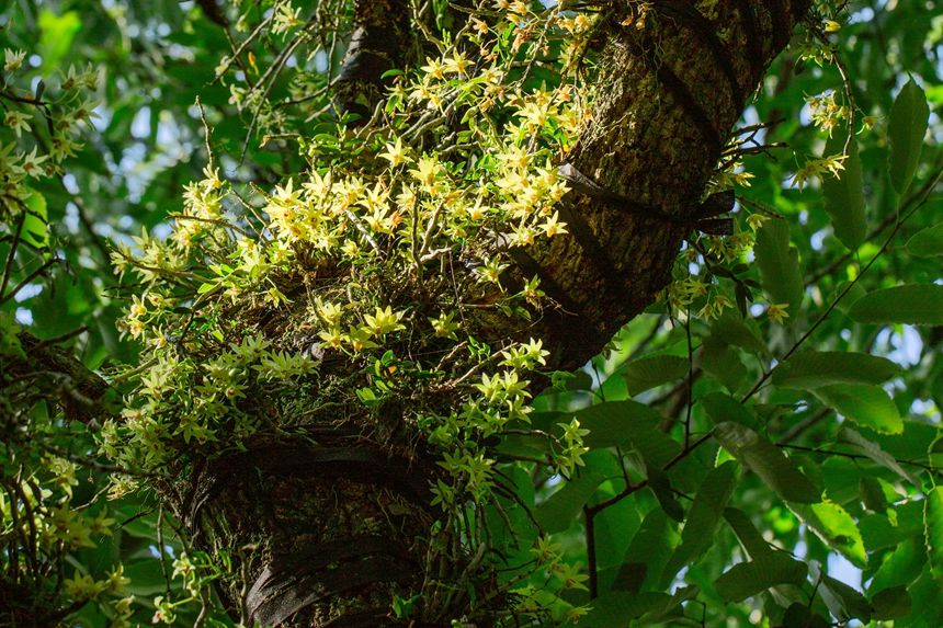 Photo shows blooming dendrobium catenatum flowers at a planting base in Zhoubang village, Xilin county, Baise, southwest China's Guangxi Zhuang Autonomous Region. (Photo/Li Shihua)