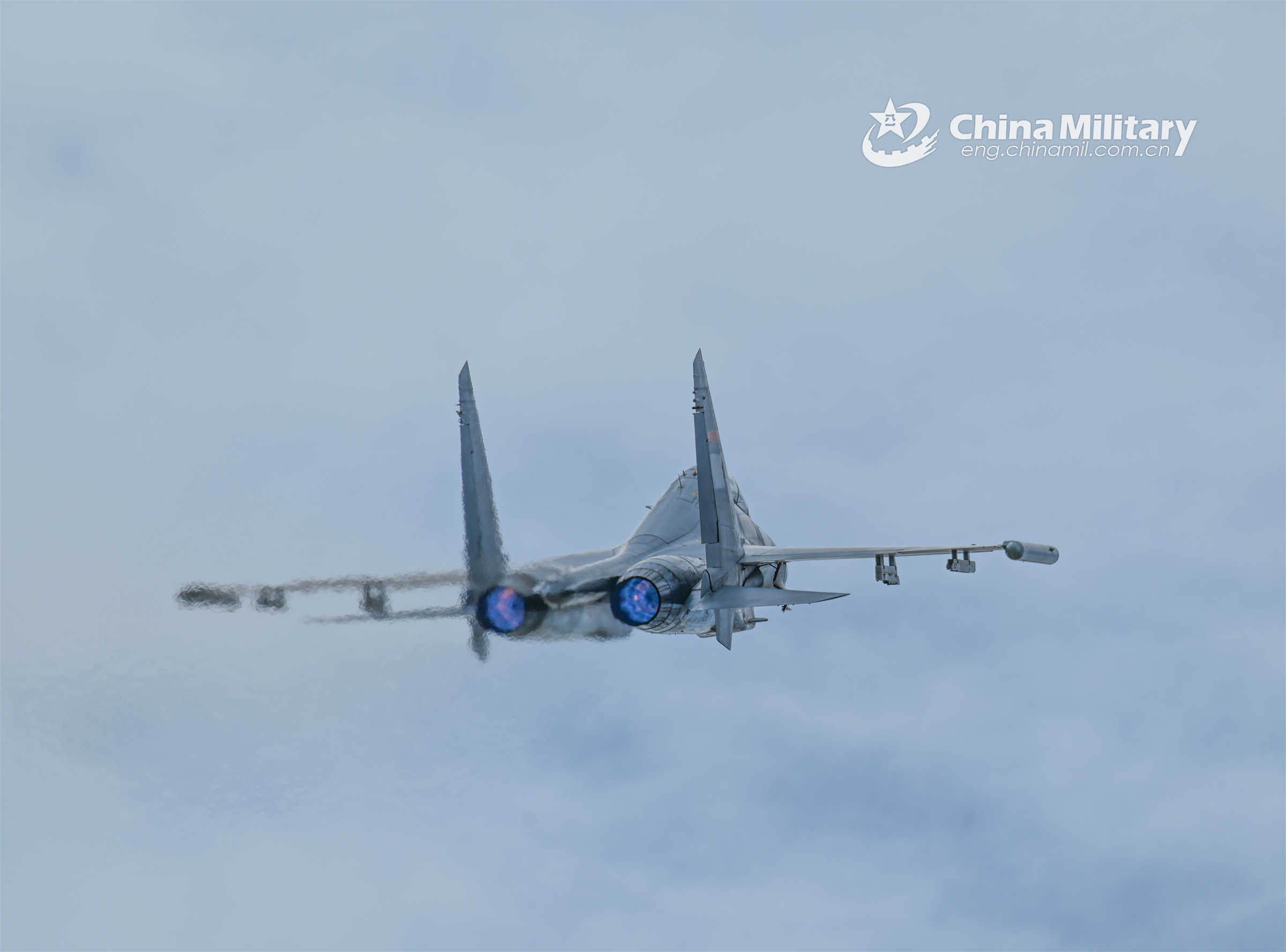 A fighter jet attached to an aviation brigade of the air force under the PLA Western Theater Command soars into the air during a flight training exercise on May 11, 2023. (eng.com.cn/Photo by Yu Zeqi)