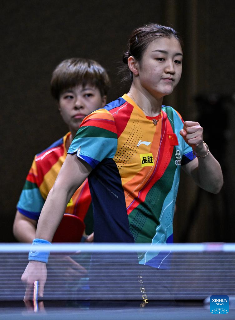 Chen Meng (R)/Wang Yidi of China celebrate during the women's doubles round of 16 match against Andreea Dragoman/Elizabeta Samara of Romania at 2023 ITTF Table Tennis World Championships Finals in Durban, South Africa, May 24, 2023. (Xinhua/Tao Xiyi)