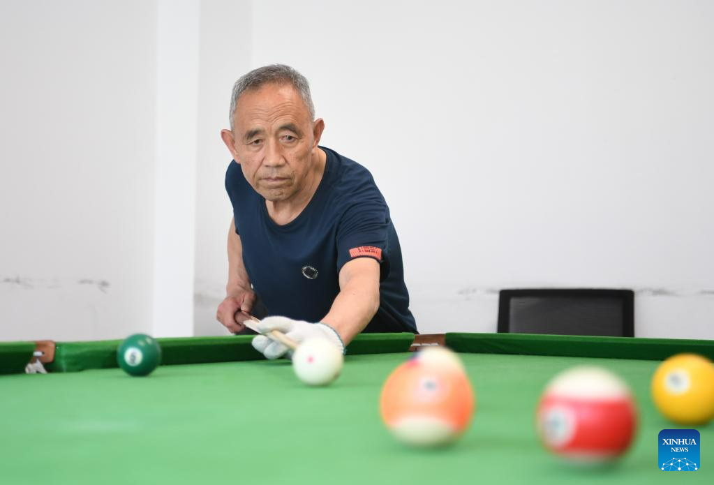 A resident plays billiards at Nanwenying community in Rongdong District of the Xiong'an New Area, north China's Hebei Province, May 23, 2023. In recent years, Nanwenying community in Xiong'an New Area, Hebei Province has constantly improved the community public service system. A number of neighborhood-level public service facilities, such as community canteen, community meeting room, retirement station, and convenience service station, have been built to serve residents and create a "15-minute living service circle" for livable communities. (Xinhua/Zhu Xudong)