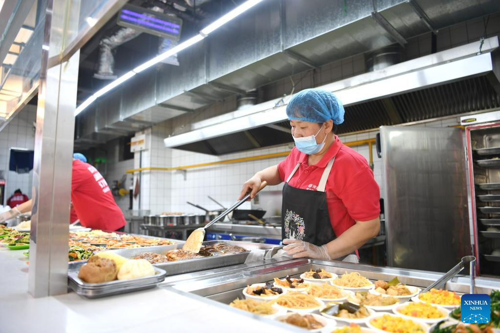 A staff member prepares meal at a canteen of Nanwenying community in Rongdong District of the Xiong'an New Area, north China's Hebei Province, May 23, 2023. In recent years, Nanwenying community in Xiong'an New Area, Hebei Province has constantly improved the community public service system. A number of neighborhood-level public service facilities, such as community canteen, community meeting room, retirement station, and convenience service station, have been built to serve residents and create a "15-minute living service circle" for livable communities. (Xinhua/Zhu Xudong)
