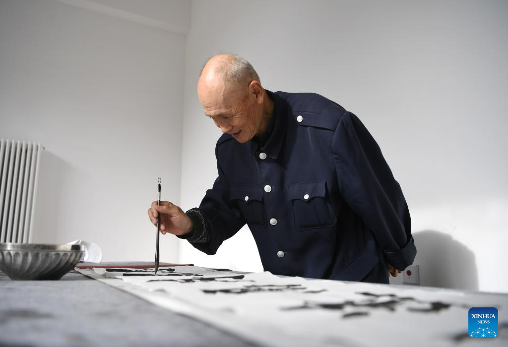 A resident practices calligraphy at Nanwenying community in Rongdong District of the Xiong'an New Area, north China's Hebei Province, May 23, 2023. In recent years, Nanwenying community in Xiong'an New Area, Hebei Province has constantly improved the community public service system. A number of neighborhood-level public service facilities, such as community canteen, community meeting room, retirement station, and convenience service station, have been built to serve residents and create a "15-minute living service circle" for livable communities. (Xinhua/Zhu Xudong)