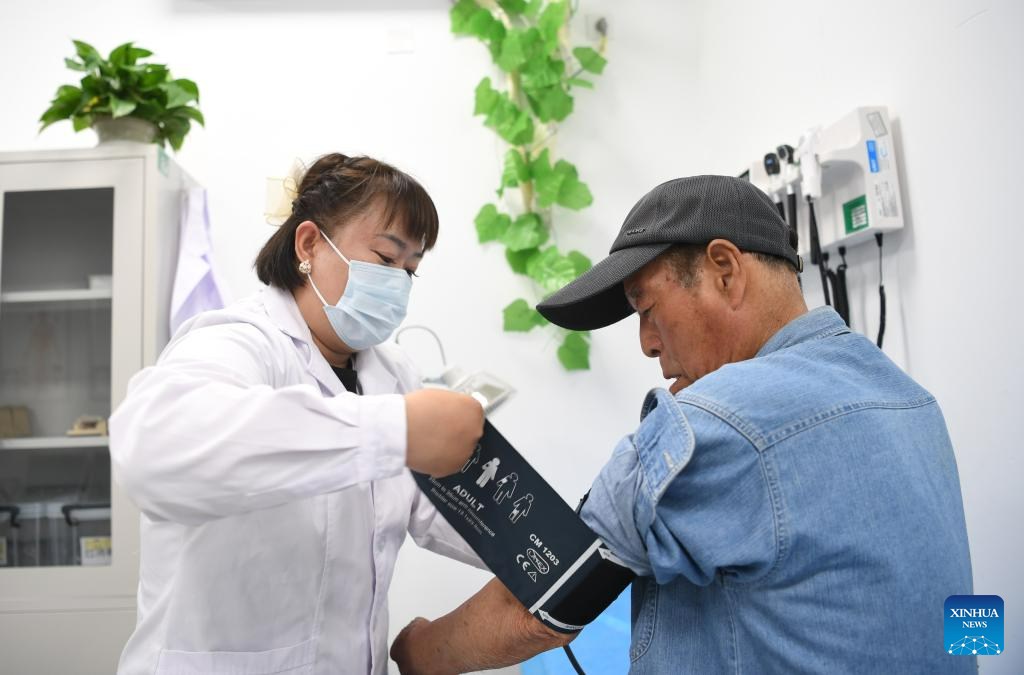 A staff member (L) measures blood pressure for a resident at a health service center of Nanwenying community in Rongdong District of the Xiong'an New Area, north China's Hebei Province, May 23, 2023. In recent years, Nanwenying community in Xiong'an New Area, Hebei Province has constantly improved the community public service system. A number of neighborhood-level public service facilities, such as community canteen, community meeting room, retirement station, and convenience service station, have been built to serve residents and create a "15-minute living service circle" for livable communities. (Xinhua/Zhu Xudong)