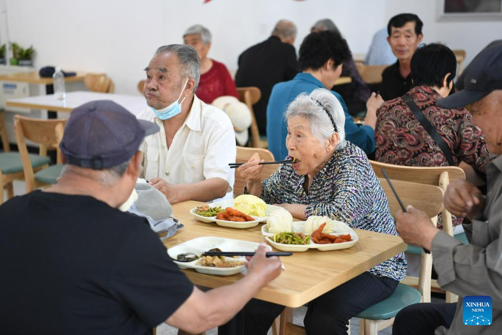 Elderly people dine at a canteen of Nanwenying community in Rongdong District of the Xiong'an New Area, north China's Hebei Province, May 23, 2023. In recent years, Nanwenying community in Xiong'an New Area, Hebei Province has constantly improved the community public service system. A number of neighborhood-level public service facilities, such as community canteen, community meeting room, retirement station, and convenience service station, have been built to serve residents and create a "15-minute living service circle" for livable communities. (Xinhua/Zhu Xudong)