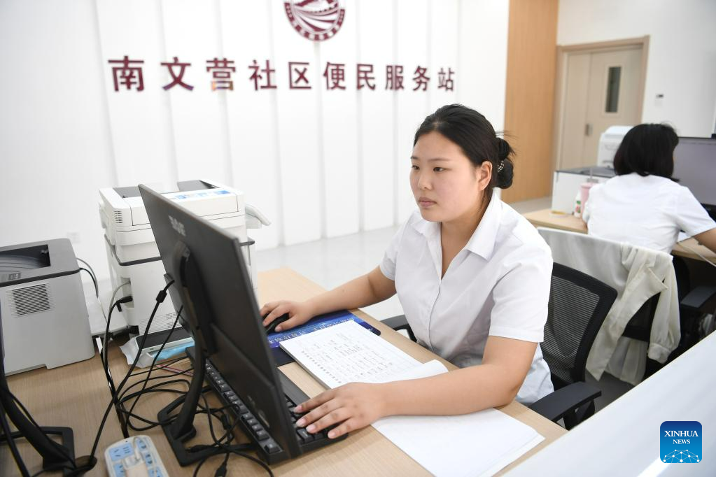 A staff member works at a service station of Nanwenying community in Rongdong District of the Xiong'an New Area, north China's Hebei Province, May 23, 2023. In recent years, Nanwenying community in Xiong'an New Area, Hebei Province has constantly improved the community public service system. A number of neighborhood-level public service facilities, such as community canteen, community meeting room, retirement station, and convenience service station, have been built to serve residents and create a "15-minute living service circle" for livable communities. (Xinhua/Zhu Xudong)