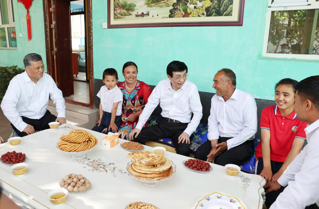 Wang Huning, a member of the Standing Committee of the Political Bureau of the Communist Party of China (CPC) Central Committee and chairman of the National Committee of the Chinese People's Political Consultative Conference, visits a Uygur family in Kashgar, northwest China's Xinjiang Uygur Autonomous Region, on May 22, 2023. Wang made an inspection tour in Xinjiang from Monday to Wednesday. (Xinhua/Yao Dawei)