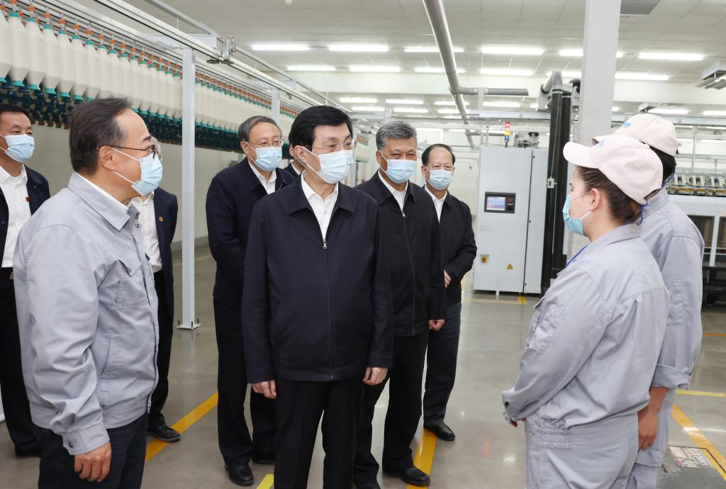 Wang Huning, a member of the Standing Committee of the Political Bureau of the Communist Party of China (CPC) Central Committee and chairman of the National Committee of the Chinese People's Political Consultative Conference, talks with workers at the workshop of an enterprise in northwest China's Xinjiang Uygur Autonomous Region, on May 23, 2023. Wang made an inspection tour in Xinjiang from Monday to Wednesday. (Xinhua/Yao Dawei)