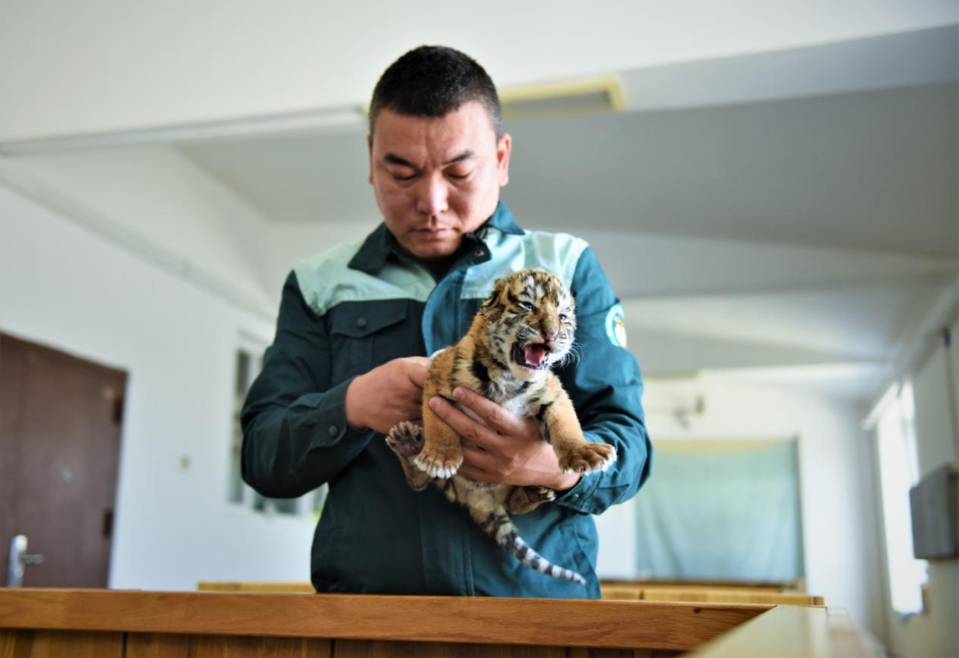 A breeder checks on the condition of a tiger cub at the Siberian Tiger Park in Harbin, northeast China's Heilongjiang Province. (Photo/People's Daily Online)