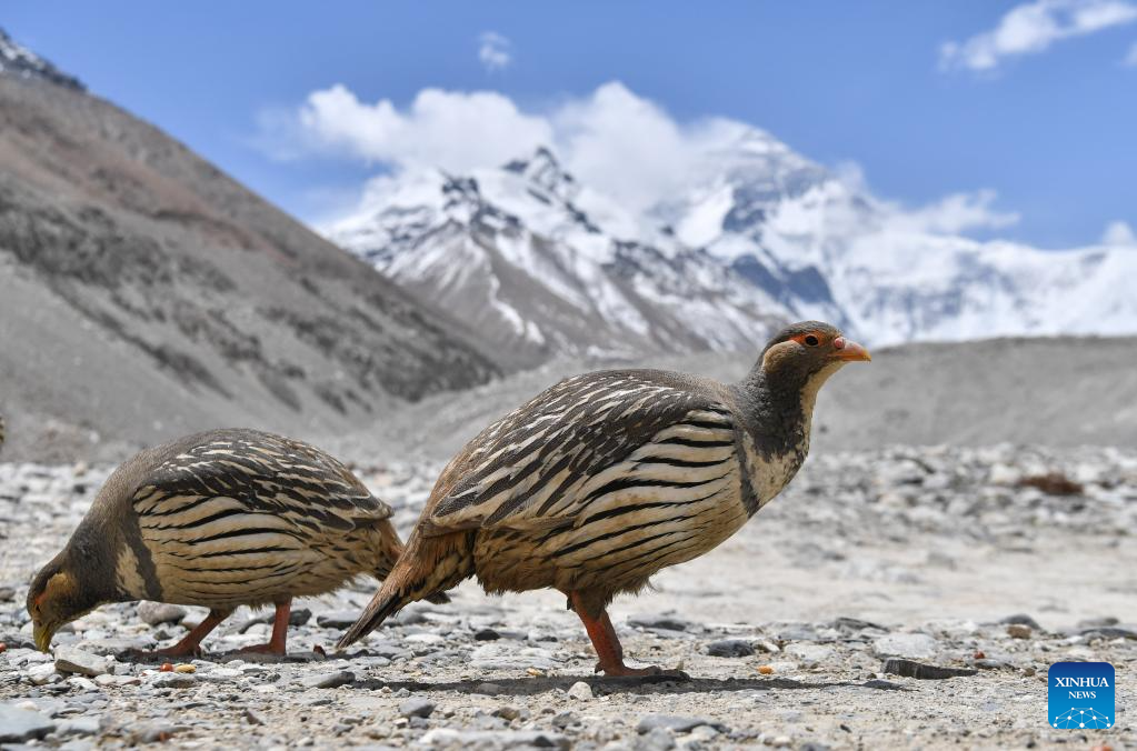 This photo taken on May 14, 2023 shows Tibetan snowcocks at the foot of Mount Qomolangma in southwest China's Tibet Autonomous Region.?(Xinhua/Jigme Dorje)