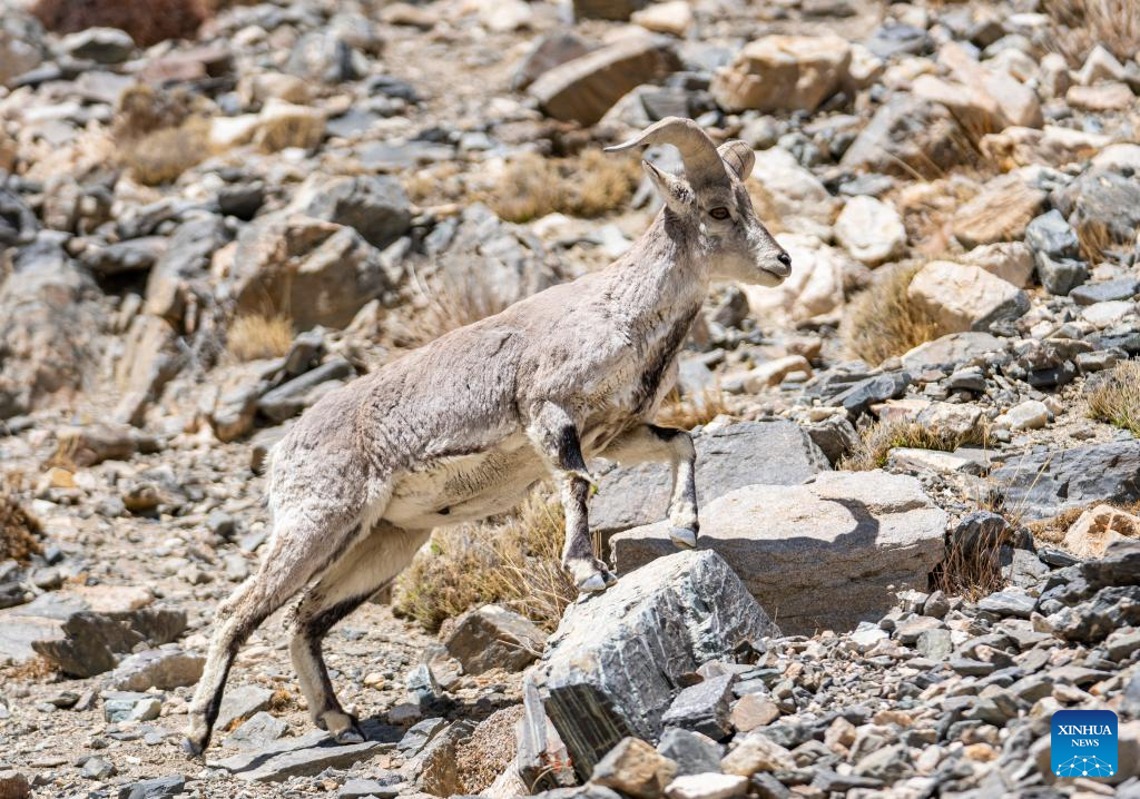 This photo taken on May 20, 2023 shows a blue sheep in Qomolangma National Nature Reserve, southwest China's Tibet Autonomous Region.?(Xinhua/Sun Fei)