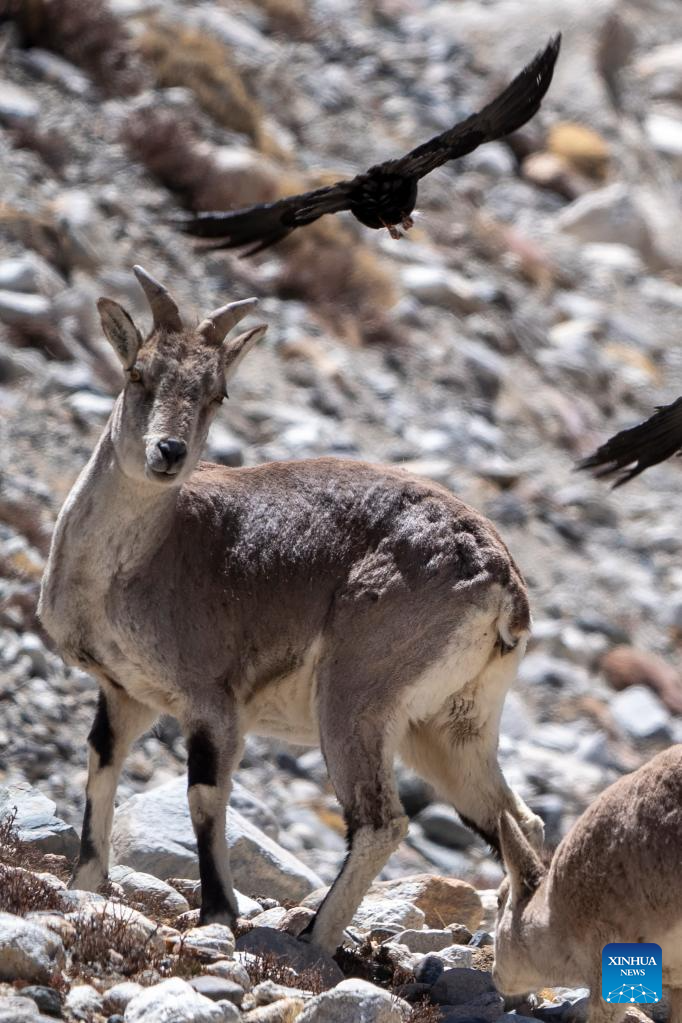 This photo taken on May 13, 2023 shows a blue sheep and a yellow-billed chough in Qomolangma National Nature Reserve, southwest China's Tibet Autonomous Region.?(Photo by Tenzin Norbu/Xinhua)