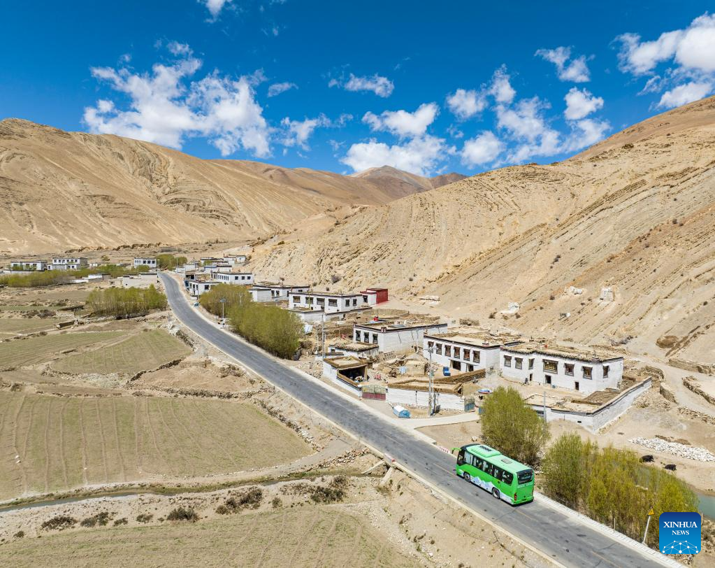 This aerial photo taken on May 25, 2023 shows an eco-friendly bus carrying tourists heading for Mount Qomolangma in southwest China's Tibet Autonomous Region.?(Xinhua/Sun Fei)