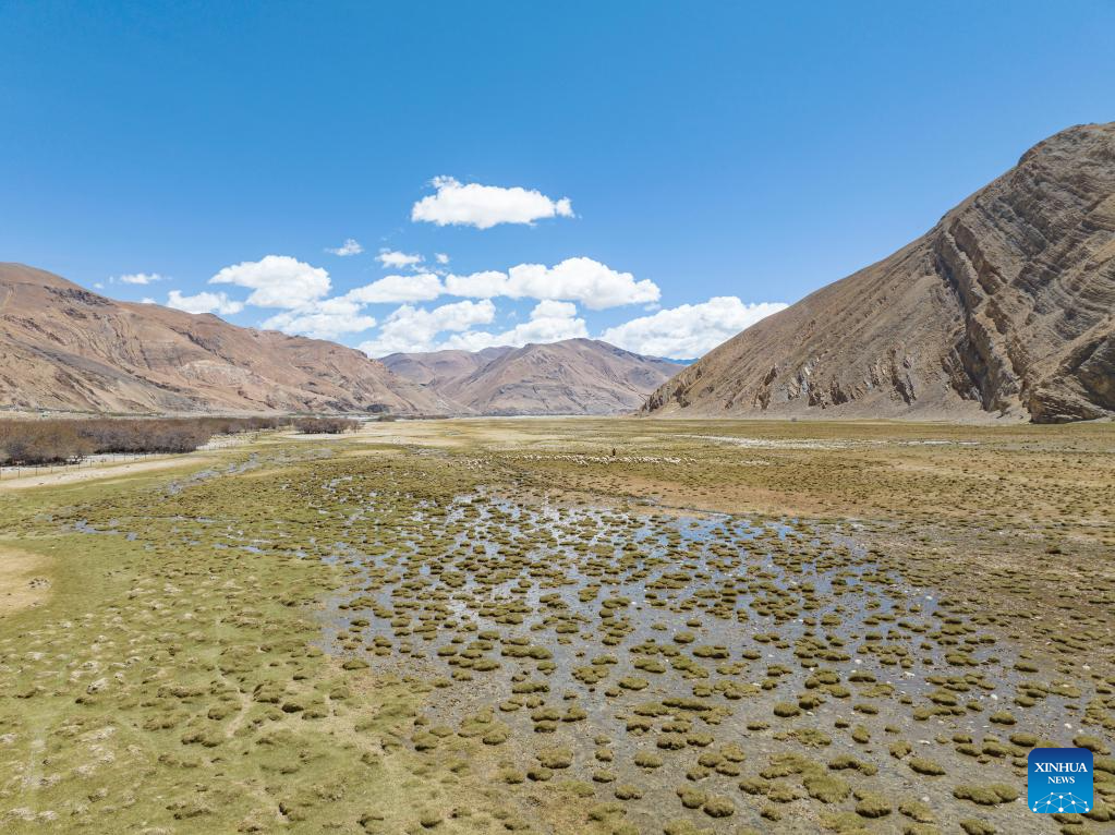 This aerial photo taken on May 25, 2023 shows wetlands in Qomolangma National Nature Reserve, southwest China's Tibet Autonomous Region.?(Xinhua/Sun Fei)