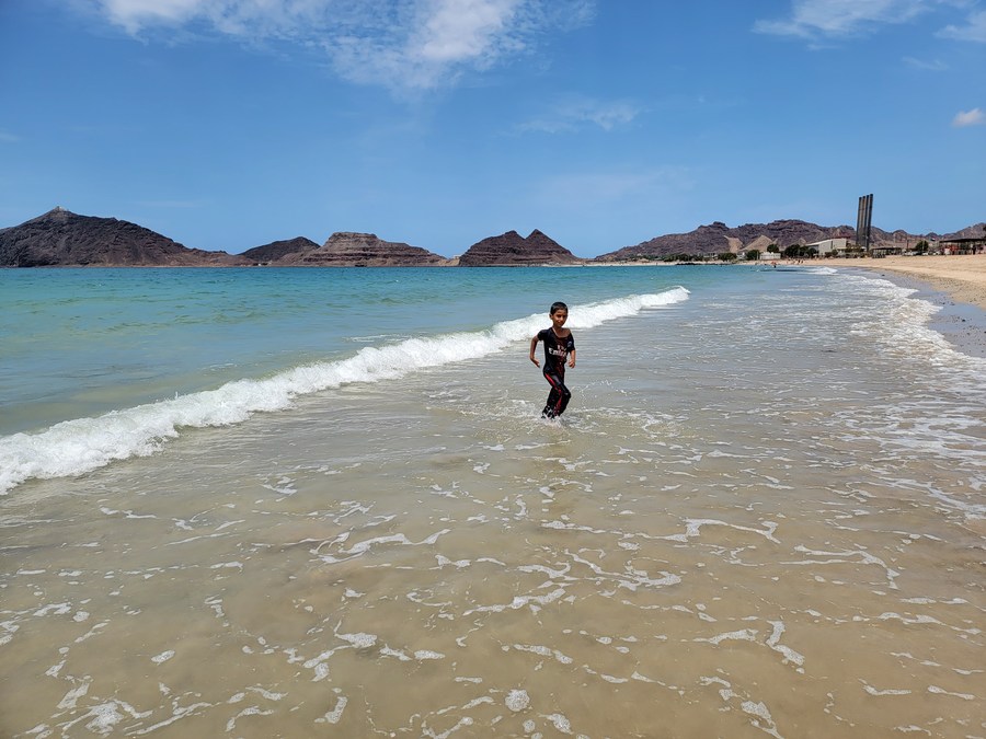 A child plays on the beach to avoid power outages amid scorching summer heat in the southern port city of Aden, Yemen, on May 25, 2023. (Xinhua/Murad Abdo)