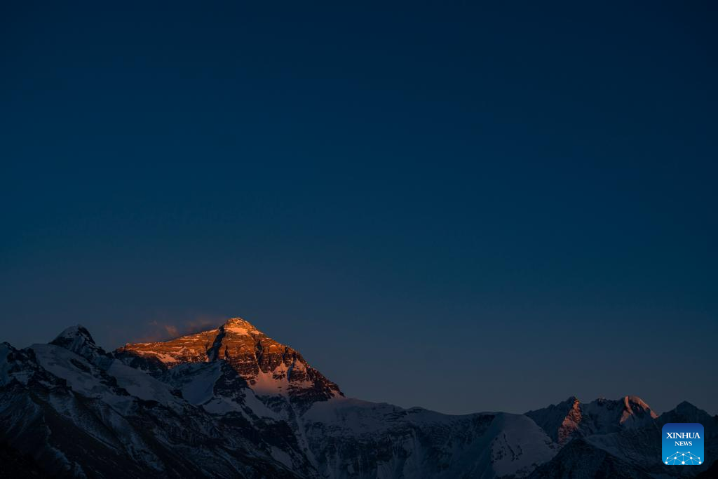 This photo taken on May 11, 2023 shows a view of Mount Qomolangma in the sunset in southwest China's Tibet Autonomous Region. (Xinhua/Sun Fei)