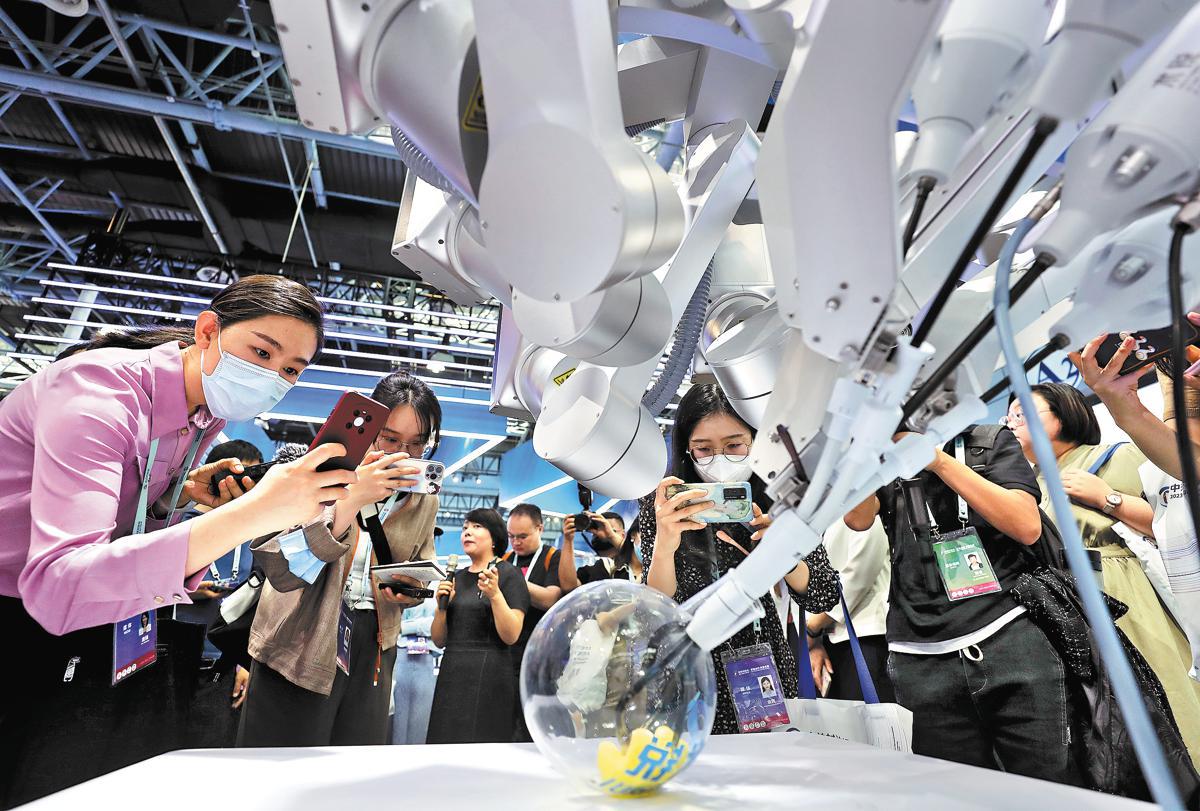 A surgical robot peels a raw egg without damaging the eggshell membrane during a media preview on Wednesday for the Beijing International High-tech Expo, part of the Zhongguancun Forum. The forum opened in Beijing on Thursday and runs through Tuesday. ZHANG WEI/CHINA DAILY