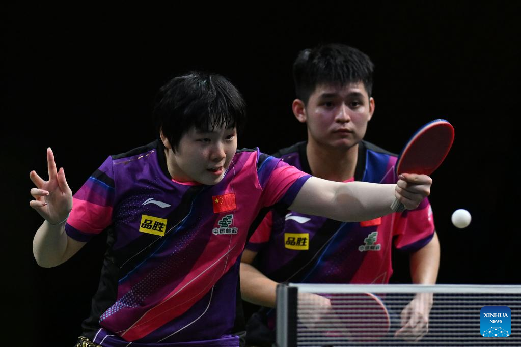 Lin Shidong/Kuai Man(L) of China compete during the mixed doubles semifinal match against Harimoto Tomokazu/Hayata Hina of Japan at 2023 ITTF Table Tennis World Championships Finals in Durban, South Africa, May 25, 2023. (Xinhua/Tao Xiyi)