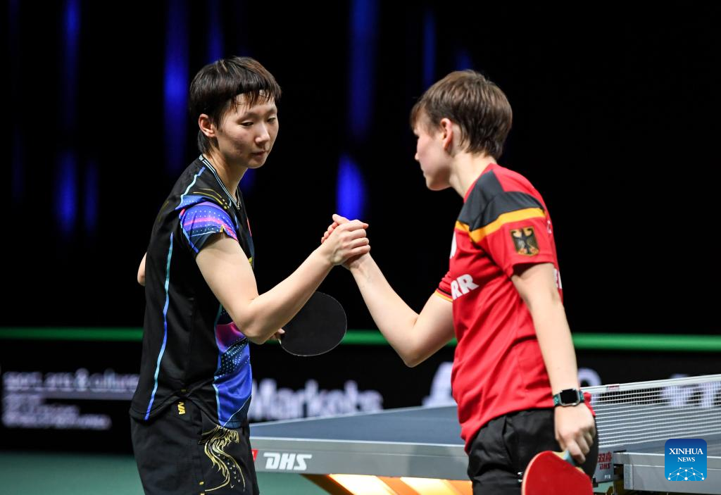 Wang Manyu (L) of China greets Nina Mittelham of Germany after their women's singles round of 16 match at 2023 ITTF Table Tennis World Championships Finals in Durban, South Africa, May 25, 2023. (Xinhua/Li Yahui)
