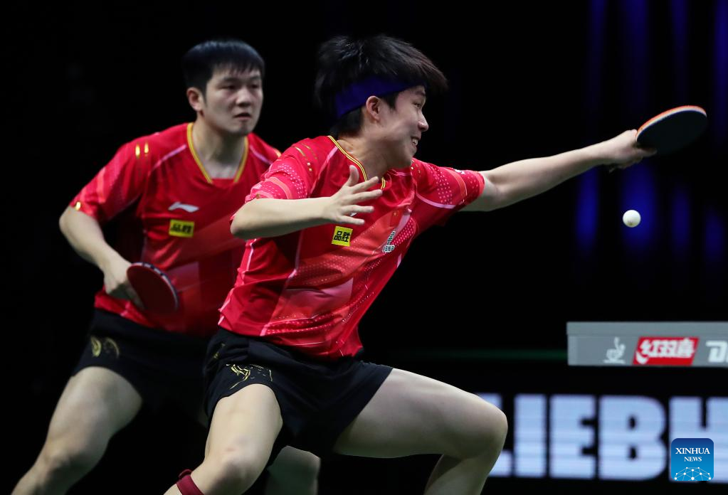 Fan Zhendong (R) of China hits a return during the men's singles round of 16 match against Qiu Dang of Germany at 2023 ITTF Table Tennis World Championships Finals in Durban, South Africa, May 25, 2023. (Xinhua/Li Yahui)