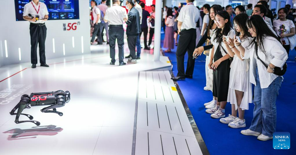 Visitors interact with a robotic dog at the China International Big Data Industry Expo 2023 in Guiyang, capital of southwest China's Guizhou Province, May 26, 2023. The China International Big Data Industry Expo 2023 kicked off on Friday in Guiyang, showcasing the country's latest achievements in the big data industry and promoting relevant business exchanges. (Xinhua/Tao Liang)