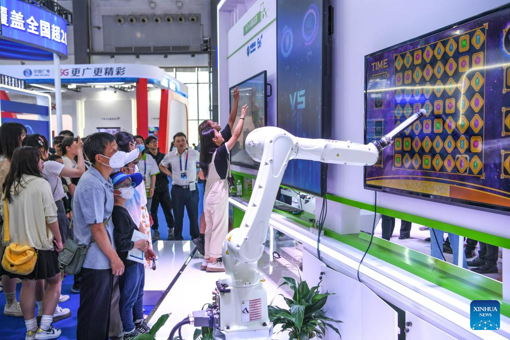 Visitors look at intelligent machinery at the China International Big Data Industry Expo 2023 in Guiyang, capital of southwest China's Guizhou Province, May 26, 2023. The China International Big Data Industry Expo 2023 kicked off on Friday in Guiyang, showcasing the country's latest achievements in the big data industry and promoting relevant business exchanges. (Xinhua/Tao Liang)