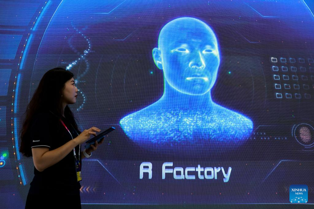 An exhibitor introduces Tencent Cloud digital twin factory at the China International Big Data Industry Expo 2023 in Guiyang, capital of southwest China's Guizhou Province, May 26, 2023. The China International Big Data Industry Expo 2023 kicked off on Friday in Guiyang, showcasing the country's latest achievements in the big data industry and promoting relevant business exchanges. (Xinhua/Ou Dongqu)