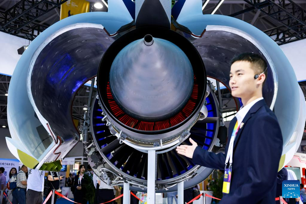 An exhibitor introduces CJ1000A civil turbofan engine at the China International Big Data Industry Expo 2023 in Guiyang, capital of southwest China's Guizhou Province, May 26, 2023. The China International Big Data Industry Expo 2023 kicked off on Friday in Guiyang, showcasing the country's latest achievements in the big data industry and promoting relevant business exchanges. (Xinhua/Ou Dongqu)