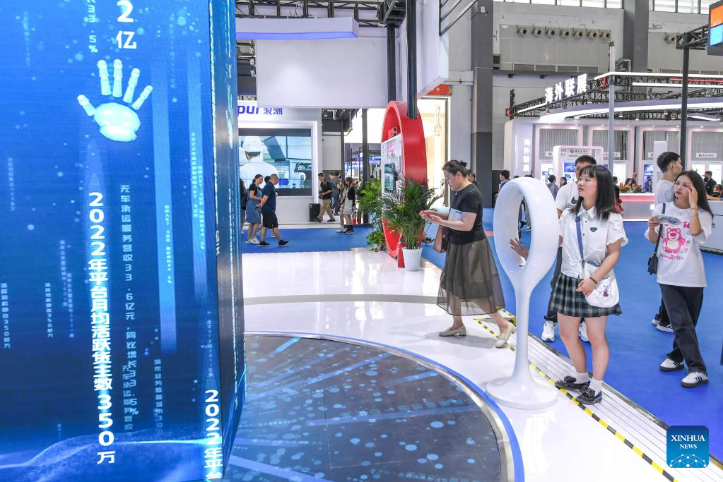 Visitors experience a self-driving car at the China International Big Data Industry Expo 2023 in Guiyang, capital of southwest China's Guizhou Province, May 26, 2023. The China International Big Data Industry Expo 2023 kicked off on Friday in Guiyang, showcasing the country's latest achievements in the big data industry and promoting relevant business exchanges. (Xinhua/Tao Liang)