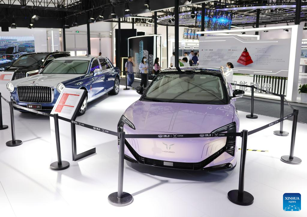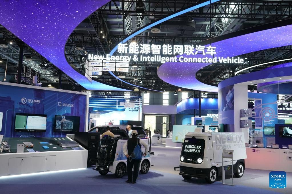 This photo taken on May 26, 2023 shows new energy and intelligent connected vehicles displayed at the exhibition center of Zhongguancun National Independent Innovation Demonstration Zone in Beijing, capital of China. At the exhibition area of this year's Zhongguancun Forum (ZGC Forum), a myriad of intelligent technological products and applications are shaping a promising vision of future life for people from across the globe. (Xinhua/Ren Chao)