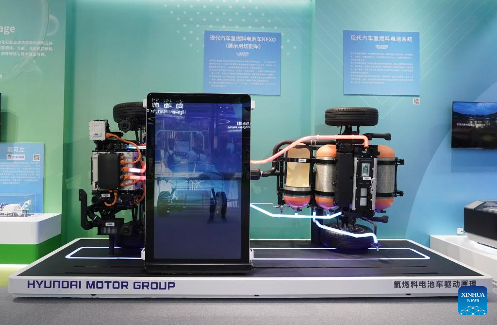 This photo taken on May 26, 2023 shows a Hyundai hydrogen fuel cell vehicle for display at the exhibition center of Zhongguancun National Independent Innovation Demonstration Zone in Beijing, capital of China. At the exhibition area of this year's Zhongguancun Forum (ZGC Forum), a myriad of intelligent technological products and applications are shaping a promising vision of future life for people from across the globe. (Xinhua/Ren Chao)