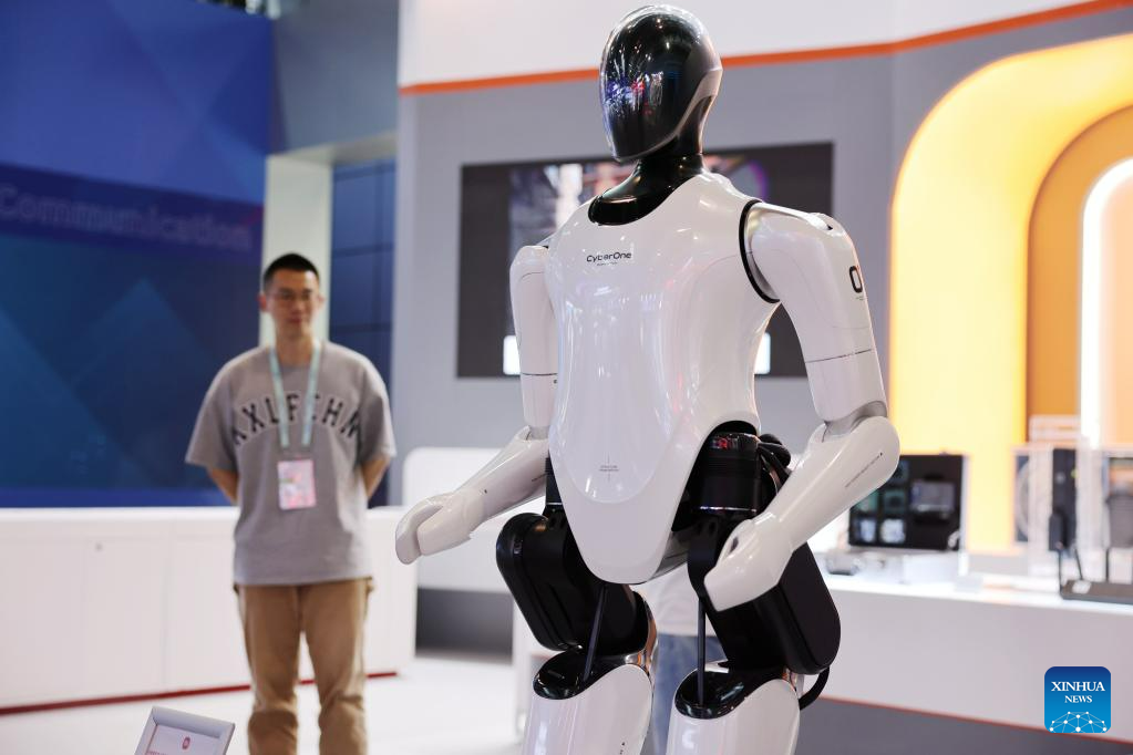 This photo taken on May 26, 2023 shows a full-size humanoid bionic robot displayed at the exhibition center of Zhongguancun National Independent Innovation Demonstration Zone in Beijing, capital of China. At the exhibition area of this year's Zhongguancun Forum (ZGC Forum), a myriad of intelligent technological products and applications are shaping a promising vision of future life for people from across the globe. (Xinhua/Zhang Chenlin)