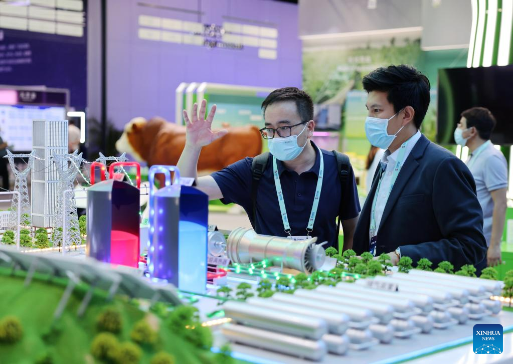A visitor learns about compressed air energy storage technology at the exhibition center of Zhongguancun National Independent Innovation Demonstration Zone in Beijing, capital of China, May 26, 2023. At the exhibition area of this year's Zhongguancun Forum (ZGC Forum), a myriad of intelligent technological products and applications are shaping a promising vision of future life for people from across the globe. (Xinhua/Zhang Chenlin)