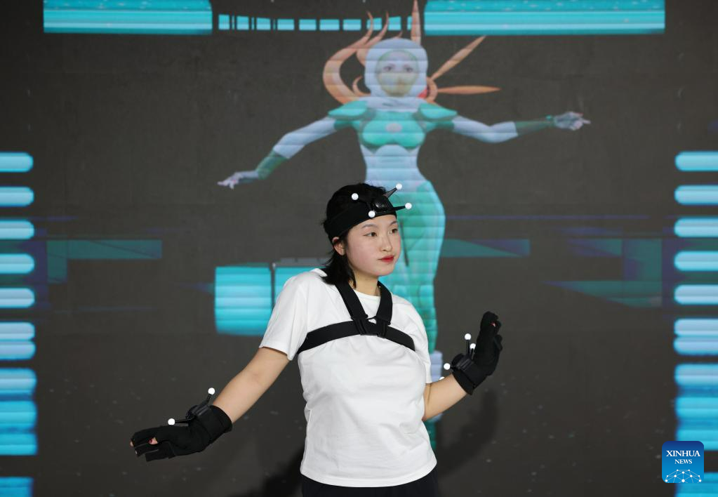 A staff member showcases a motion capture equipment at the exhibition area of Zhongguancun Forum in Beijing, capital of China, May 26, 2023. At the exhibition area of this year's Zhongguancun Forum (ZGC Forum), a myriad of intelligent technological products and applications are shaping a promising vision of future life for people from across the globe. (Xinhua/Zhang Chenlin)