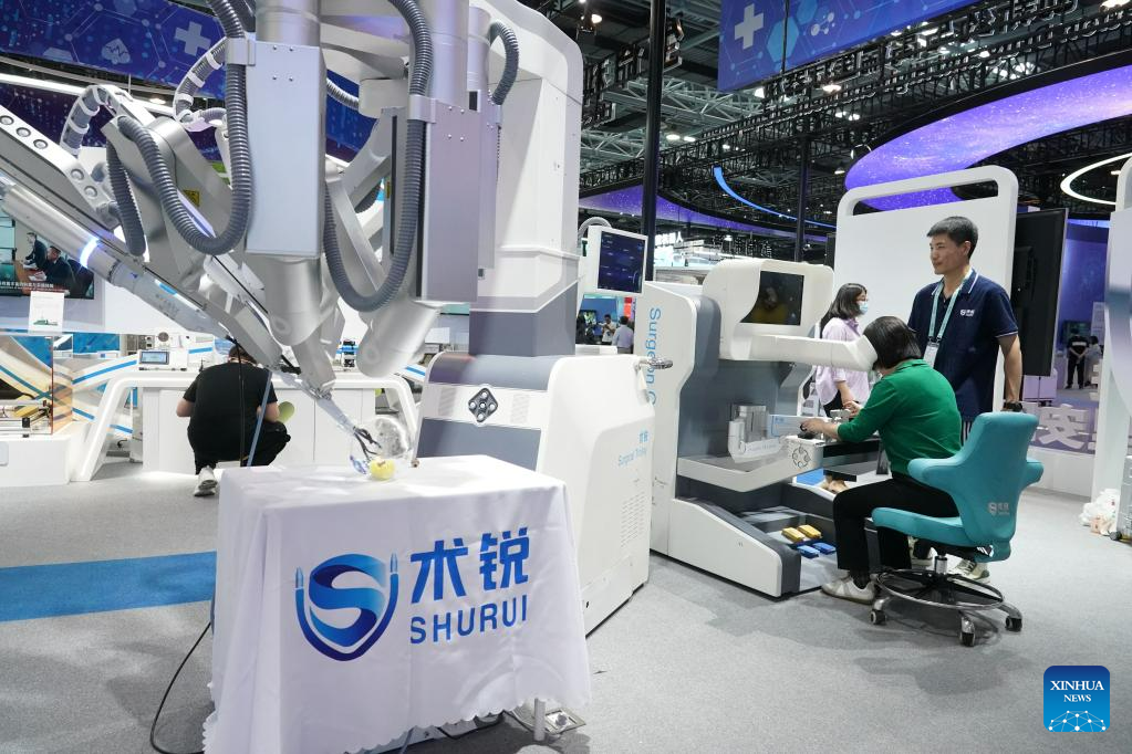 This photo taken on May 26, 2023 shows surgical robot displayed at the exhibition center of Zhongguancun National Independent Innovation Demonstration Zone in Beijing, capital of China. At the exhibition area of this year's Zhongguancun Forum (ZGC Forum), a myriad of intelligent technological products and applications are shaping a promising vision of future life for people from across the globe. (Xinhua/Ren Chao)