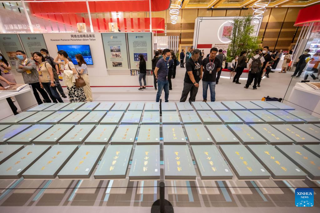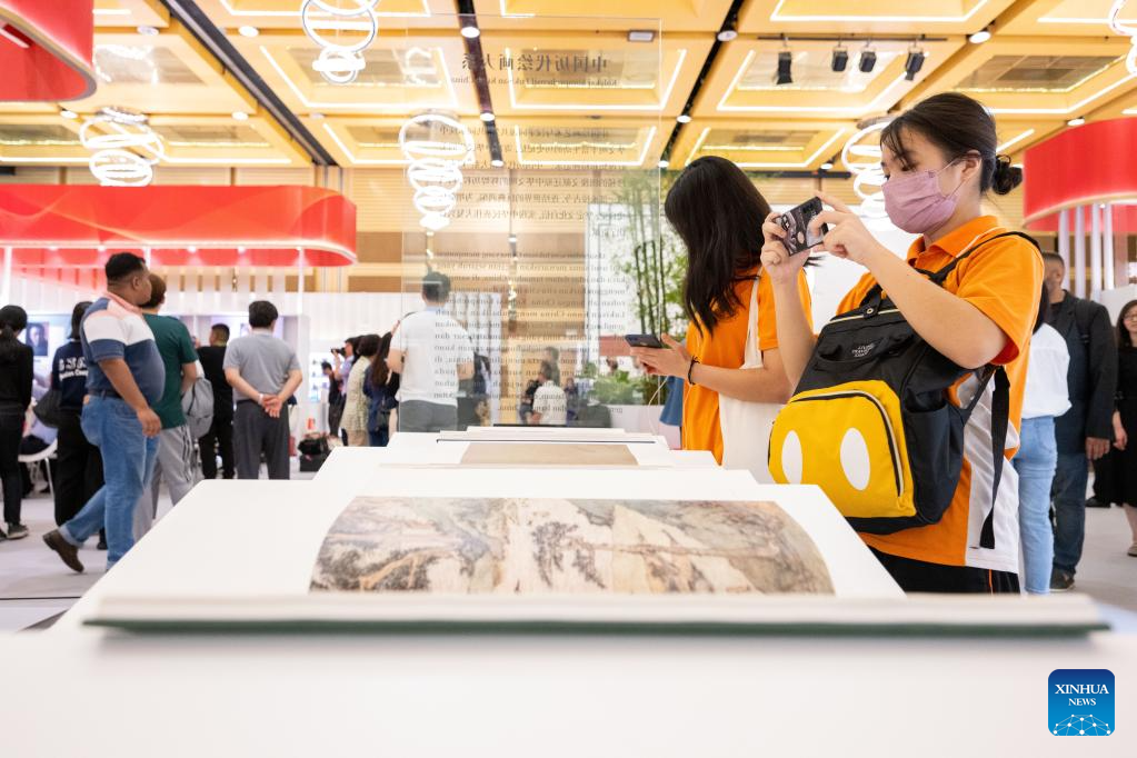 People visit an exhibition on a comprehensive collection of ancient Chinese paintings at the 40th Kuala Lumpur International Book Fair in Kuala Lumpur, Malaysia, May 26, 2023. (Xinhua/Zhu Wei)