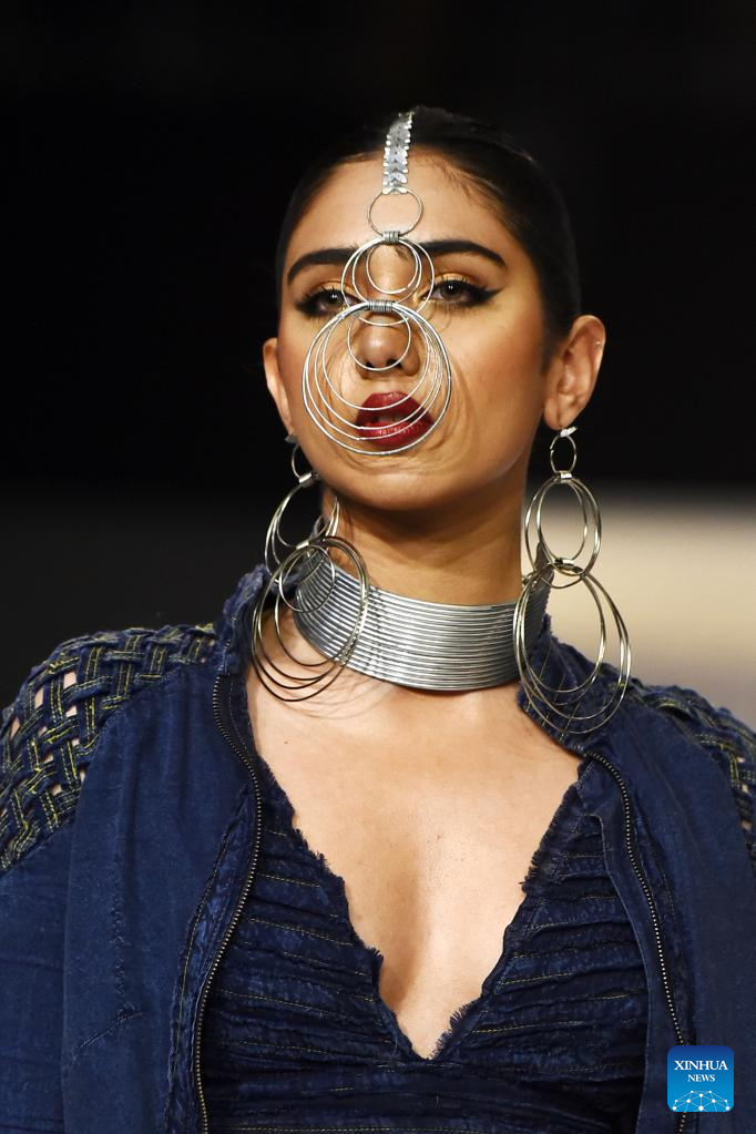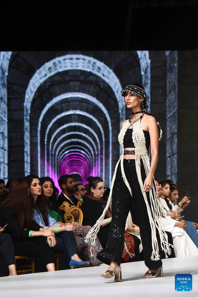 A model presents a creation during a fashion show organized by the Trade Development Authority of Pakistan (TDAP) in Karachi, Pakistan, on May 26, 2023. (Str/Xinhua)