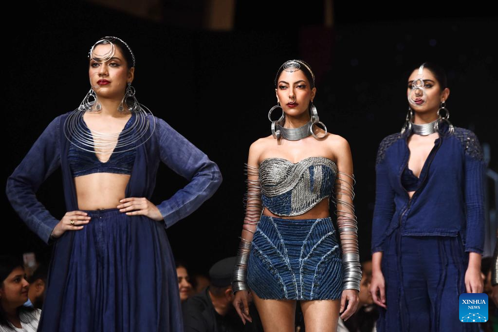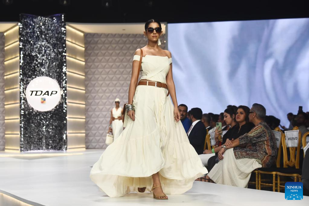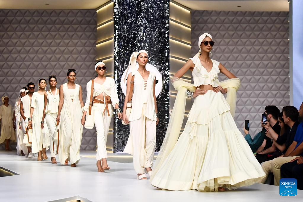 Models present creations during a fashion show organized by the Trade Development Authority of Pakistan (TDAP) in Karachi, Pakistan, on May 26, 2023. (Str/Xinhua)